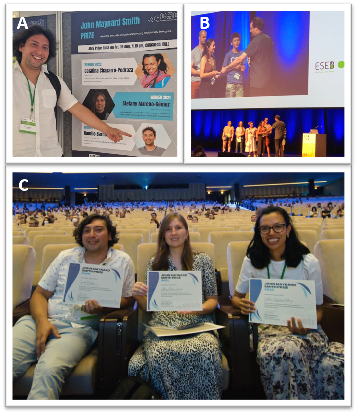 Les cuento. Estaba caminando por el centro de conferencias cuando veo un poster anunciando los ganadores del premio John Maynard Smith. Este es un premio que se da cada año a un investigador/a joven con aportes sobresalientes a la biología evolutiva. Y qué sorpresa, ahí estaba la foto de Camilo Barbosa, un viejo amigo colombiano que conocí mientras hacíamos el doctorado en Alemania. En seguida le escribí para felicitarlo y tomarle la foto correspondiente en frente del póster de los premios. Y ahí llegó la segunda sorpresa. Camilo me contó que las otras dos ganadoras del premio también eran colombianas, Stefany Moreno-Gámez y Catalina Chaparro Pedraza.